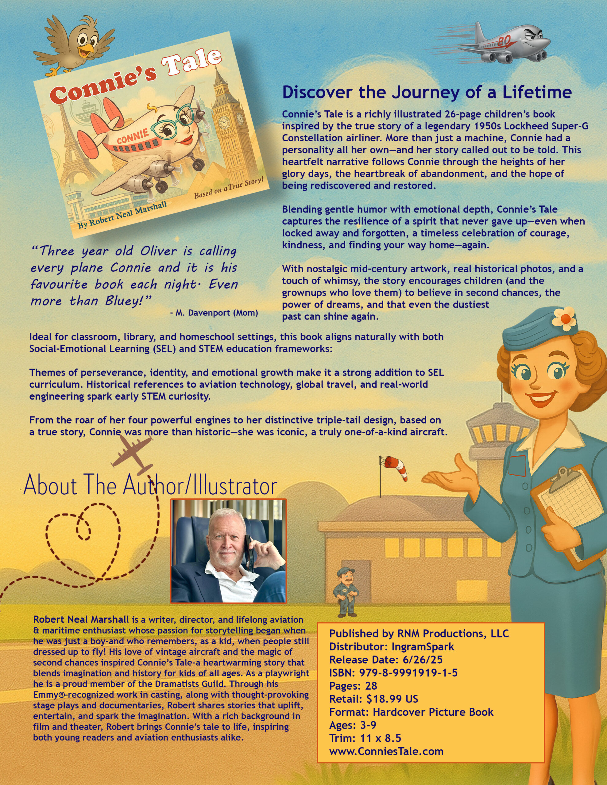 Robert Neal Marshall is a writer, director, and lifelong aviation & maritime enthusiast whose passion for storytelling began when he was just a boy-and who remembers, as a kid, when people still dressed up to fly! His love of vintage aircraft and the magic of second chances inspired Connie’s Tale-a heartwarming story that blends imagination and history for kids of all ages. He is the creator of the critically acclaimed musical Rumpelstiltskin’s Daughter, currently in development for London’s West End, and a proud member of the Dramatists Guild. Through his Emmy®-recognized work in casting, along with thought-provoking stage plays and documentaries, Robert shares stories that uplift, entertain, and spark the imagination.